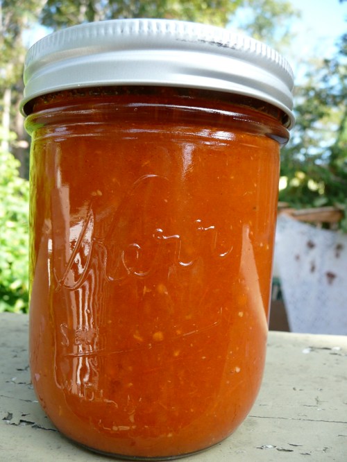 6. Freeze the sauce. (I canned the sauce in the past before I realized canning guidelines for tomato products require a certain acidity level and use of a formally tested recipe such as this one or recipes through USDA or university cooperative extension programs.) You can freeze it in jars or in ziplock freezer bags. This is easiest if you cool it first. The fastest way I’ve found to cool it is to pour all the hot sauce into a thin pot that hasn’t been sitting on the stove, and then to set that pot in a sink full of ice water that isn’t deep enough to come over the rim. Once the pot has cooled a fair bit, put it in the fridge on a coaster. The next day, ladle the refrigerated sauce into your preferred freezer containers and freeze.