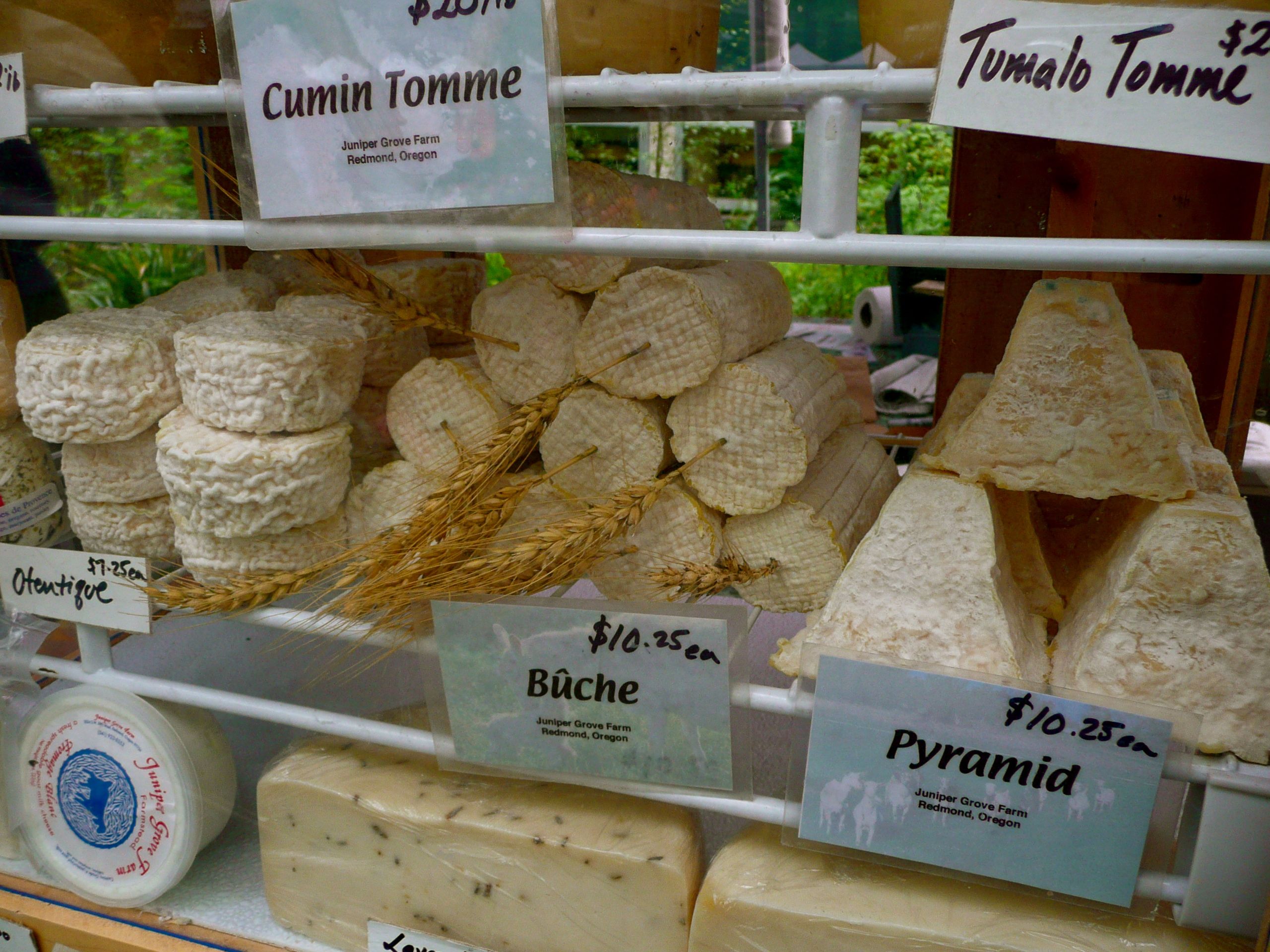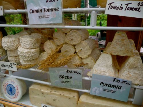 Not all cheese at markets has to be cut. The picture above is for one of my favorite cheese makers, in Oregon (that one with a stalk of wheat sticking through it is basically Debs-crack). But a lot of the less-expensive cheeses are sold by the weight. If you only want to buy a little bit of cheese, or can only afford a little, or want some of a hard cheese but don’t want, say, your own ten-pound wheel of cheddar, you need it cut. And it should be cut to order, so it stays fresh and so the customer can choose the amount.