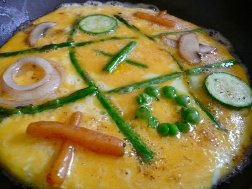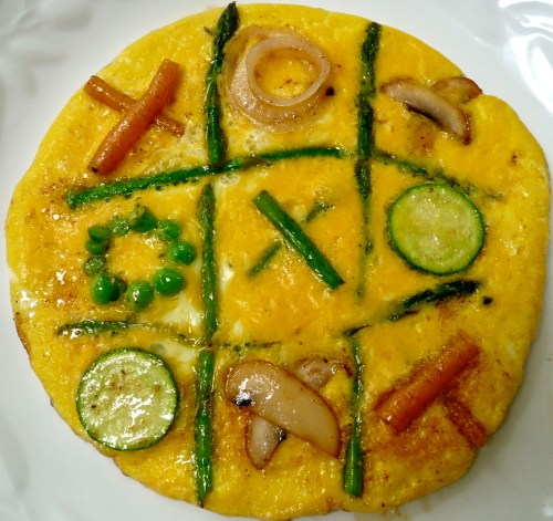 The idea’s pretty simple. If you cook your eggs on very low heat in a non-stick or well-seasoned cast iron pan, you can arrange whatever you like on the top while the omelet cooks through. Pre-sauté your vegetables or meats. Lay down a tic-tac-toe board made of two very thin asparagus stalks one direction, and two stalks broken into pieces the other direction. Play tic-tac-toe with edible Xs and Os, solo or with someone else. Let it cook, putting a lid on it for the last minute or so if necessary.